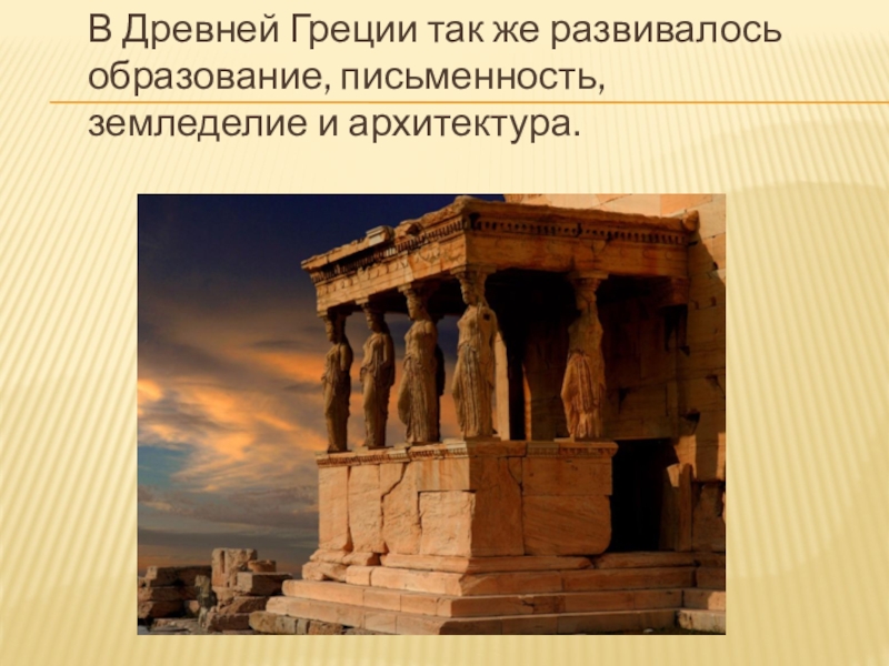 Слайд 14 В Древней Греции так же развивалось образование, письменность, земледелие