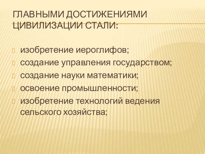 люди начали объединятся в большие общины, начали появляется цивилизации со своей особой культурой, индивидуальной письменностью, люди начали строить города.