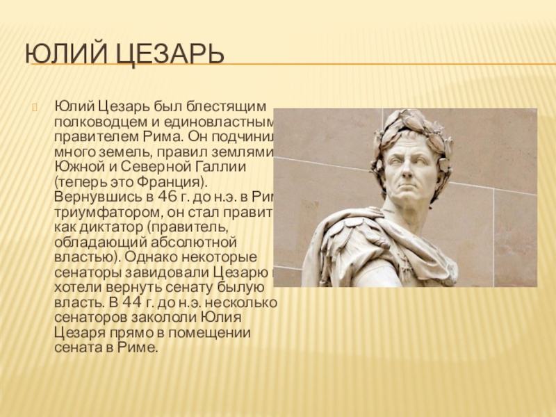 подчинил много земель, правил землями Южной и Северной Галлии (теперь это Франция). Вернувшись в 46 г. до н.э. в Рим триумфатором, он стал править как диктатор (правитель, обладающий абсолютной властью). Однако некоторые сенаторы завидовали Цезарю и хотели вернуть сенату былую власть. В 44 г. до н.э. несколько сенаторов закололи Юлия Цезаря прямо в помещении сената в Риме.