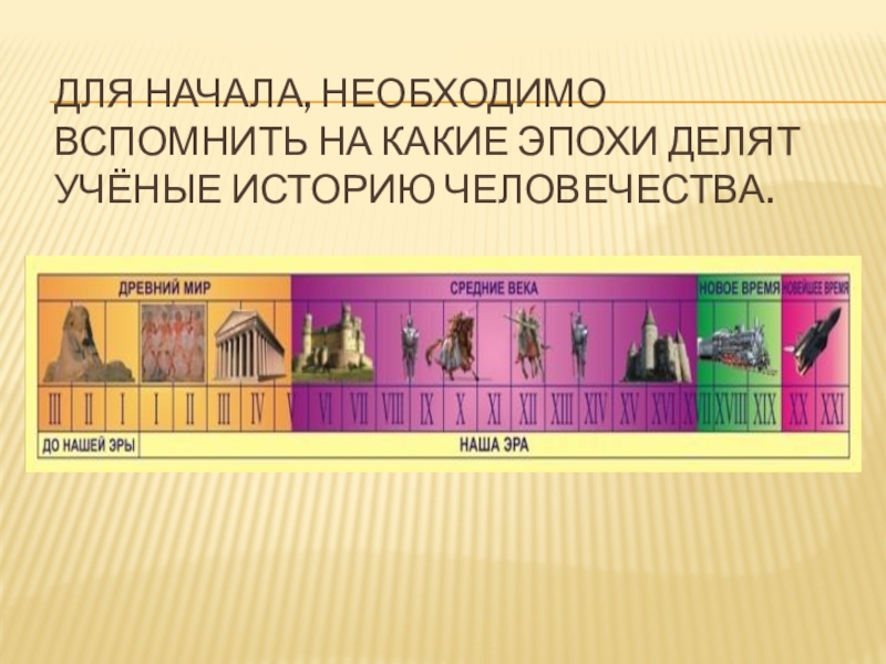Слайд 3Для начала, необходимо вспомнить на какие эпохи делят учёные историю человечества.