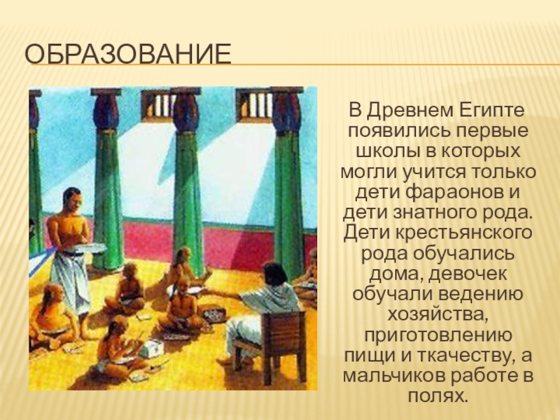 учится только дети фараонов и дети знатного рода. Дети крестьянского рода обучались дома, девочек обучали ведению хозяйства, приготовлению пищи и ткачеству, а мальчиков работе в полях.