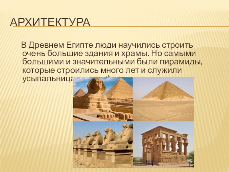 и храмы. Но самыми большими и значительными были пирамиды, которые строились много лет и служили усыпальницами для фараонов.