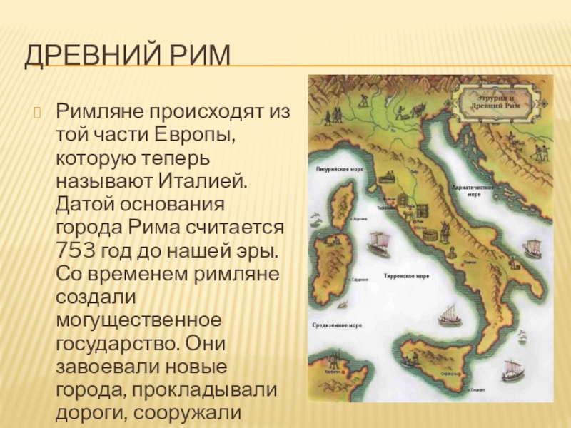Датой основания города Рима считается 753 год до нашей эры. Со временем римляне создали могущественное государство. Они завоевали новые города, прокладывали дороги, сооружали храмы.