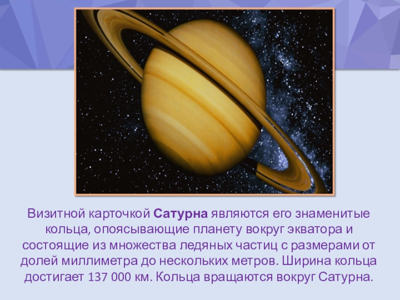 Слайд 2Визитной карточкой Сатурна являются его знаменитые кольца, опоясывающие планету вокруг экватора