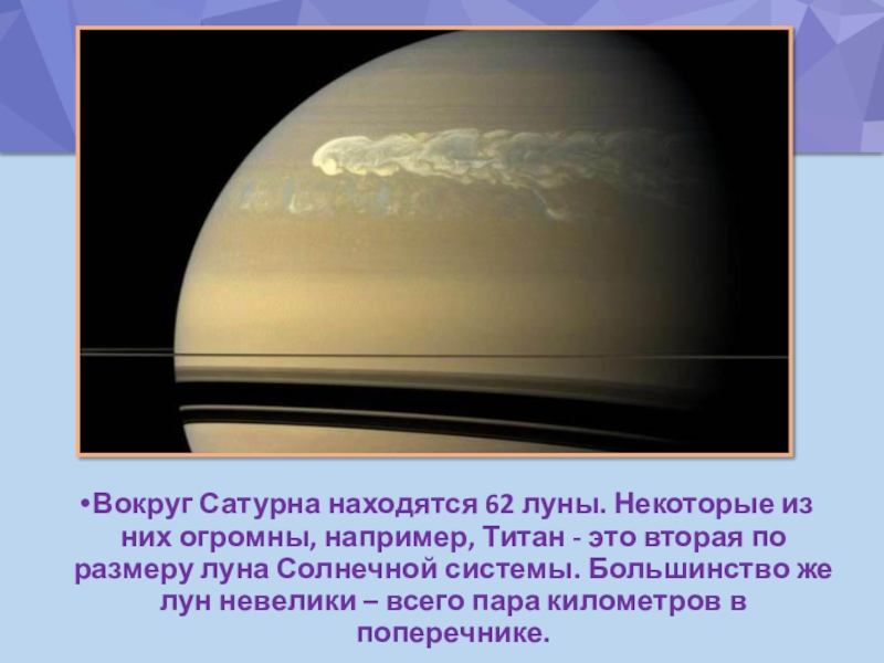 Слайд 4Вокруг Сатурна находятся 62 луны. Некоторые из них огромны, например, Титан