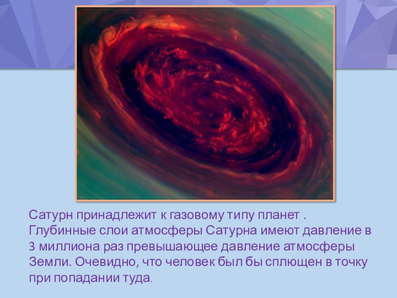 Сатурн принадлежит к газовому типу планет . Глубинные слои атмосферы Сатурна имеют давление в 3 миллиона раз