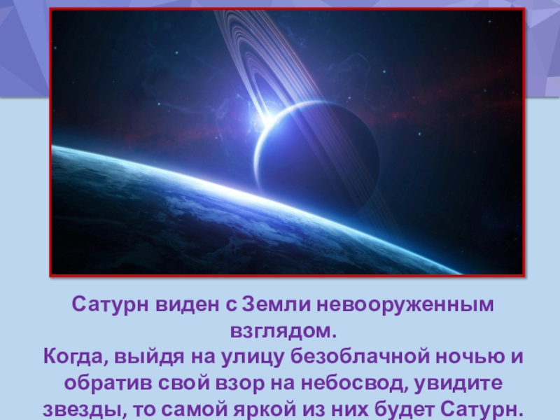 Слайд 7Сатурн виден с Земли невооруженным взглядом.