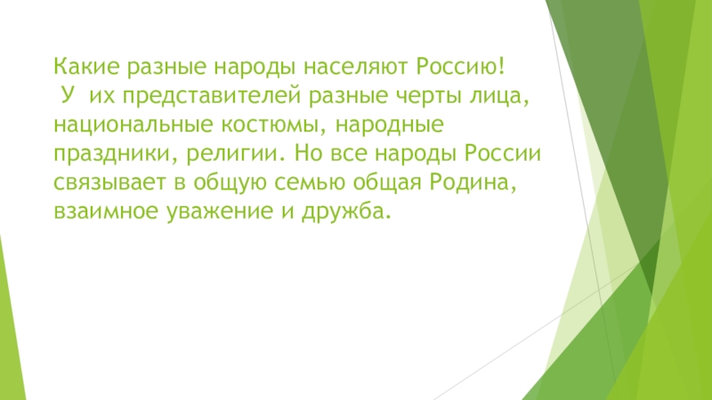 национальные костюмы, народные праздники, религии. Но все народы России связывает в общую семью общая Родина, взаимное уважение и дружба.