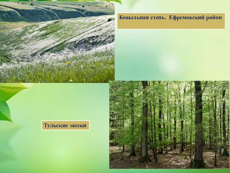 По границе с лесостепью проходят тульские засеки, которые образуют широкую полосу леса 1,5 – 2 км, где растет до 12 пород деревьев: дуб, ясень, клен, береза, осина, липа и другие…