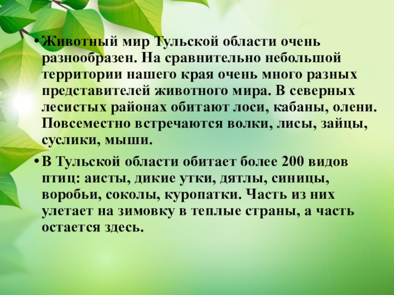 Слайд 13Животный мир Тульской области очень разнообразен. На сравнительно небольшой территории нашего