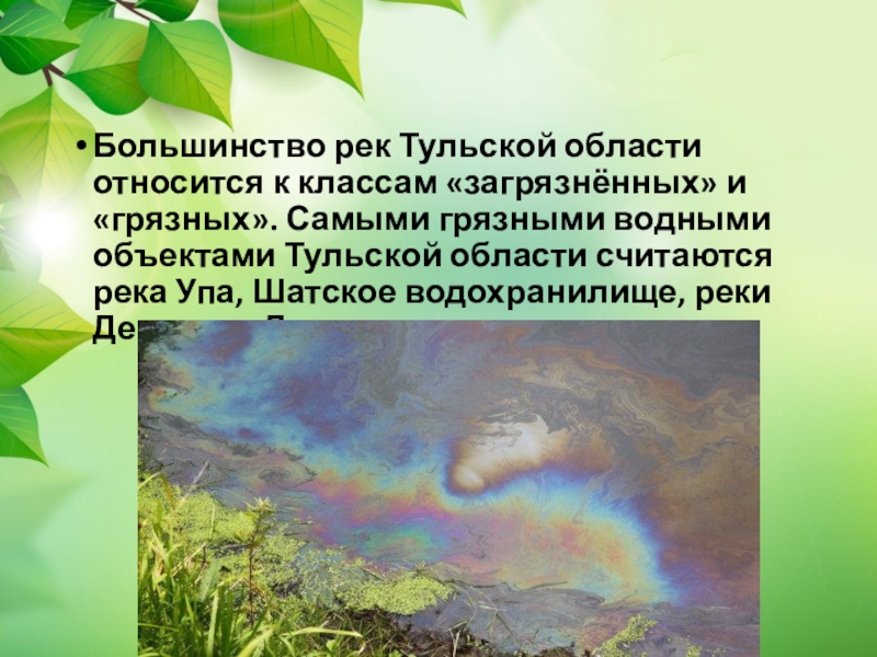 Слайд 24Большинство рек Тульской области относится к классам «загрязнённых» и «грязных». Самыми