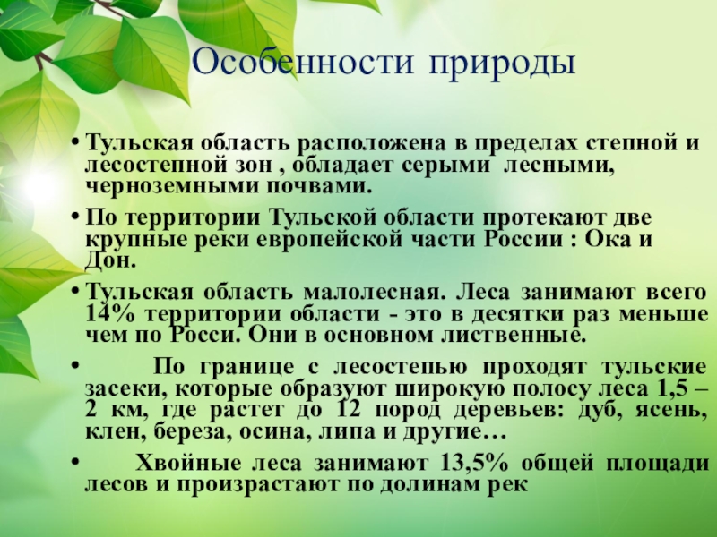 Тульская область малолесная. Леса занимают всего 14% территории области - это в десятки раз меньше чем по Росси. Они в основном лиственные.
