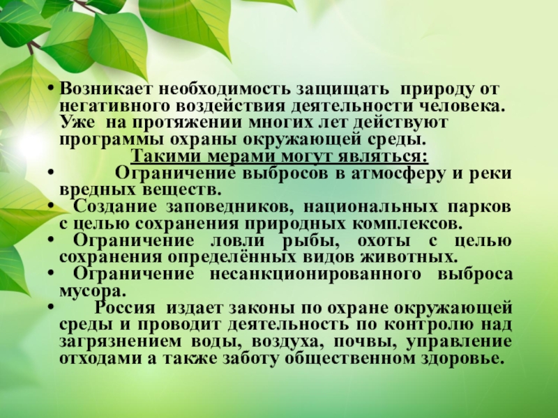 Слайд 26Возникает необходимость защищать природу от негативного воздействия деятельности человека. Уже на