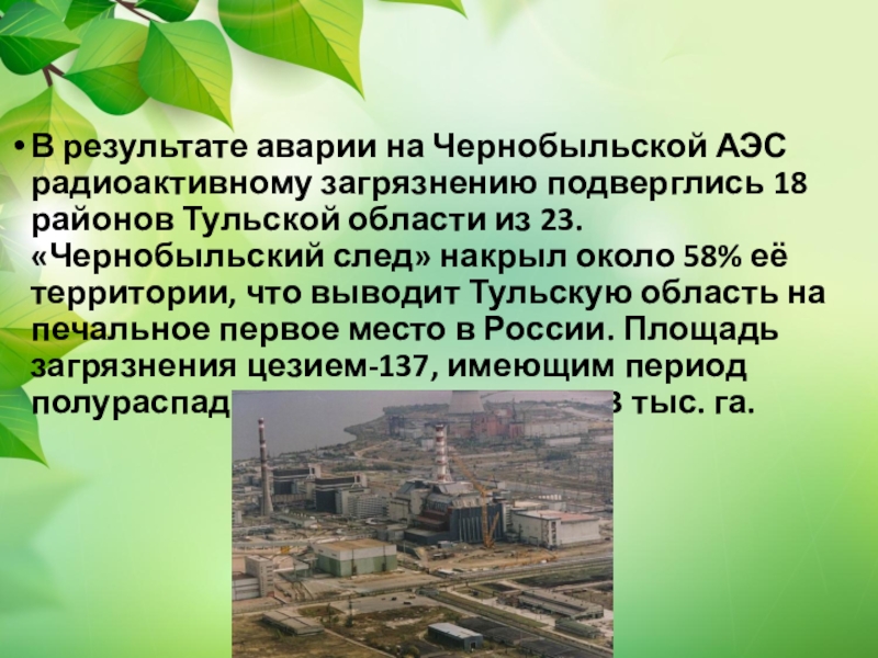 Тульской области из 23. «Чернобыльский след» накрыл около 58% её территории, что выводит Тульскую область на печальное первое место в России. Площадь загрязнения цезием-137, имеющим период полураспада 30 лет, составляет 803 тыс. га.