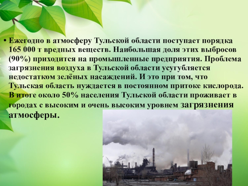 Слайд 22Ежегодно в атмосферу Тульской области поступает порядка 165 000 т вредных