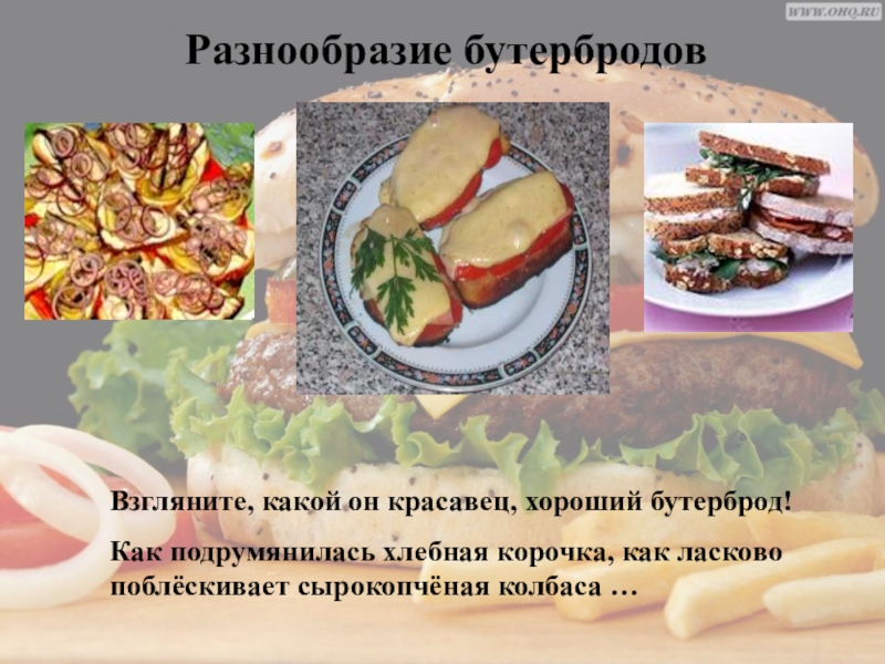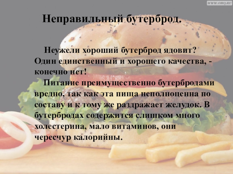 Питание преимущественно бутербродами вредно, так как эта пища неполноценна по составу и к тому же раздражает желудок. В бутербродах содержится слишком много холестерина, мало витаминов, они чересчур калорийны.