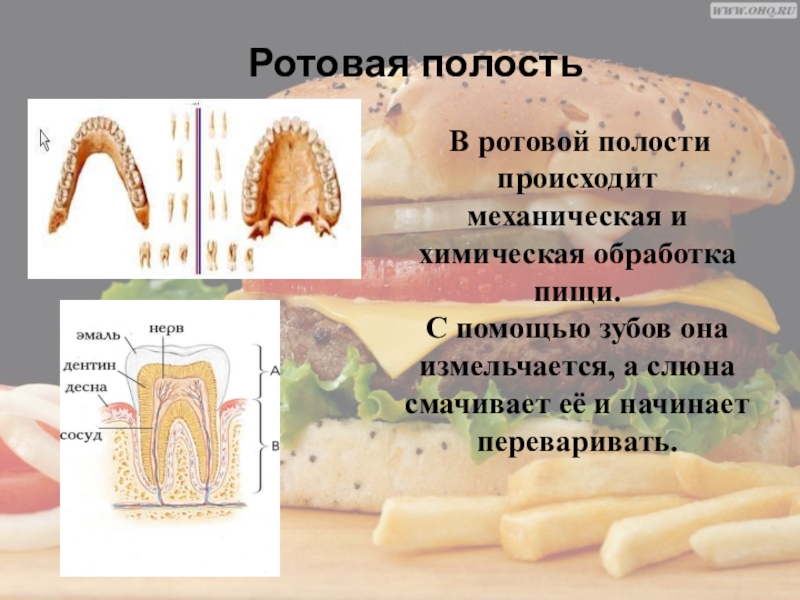 Эти питательные вещества подвергаются механической и химической обработке в пищеварительной системе. Пищеварительная система – это своего рода конвейер, по которому движется пища. Начинается он с ротовой полости.