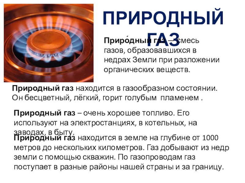 Природный газ находится в земле на глубине от 1000 метров до нескольких километров. Газ добывают из недр земли с помощью скважин. По газопроводам газ поступает в разные районы нашей страны и за границу.