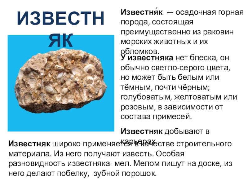 Известняк широко применяется в качестве строительного материала. Из него получают известь. Особая разновидность известняка- мел. Мелом пишут на доске, из него делают побелку, зубной порошок.