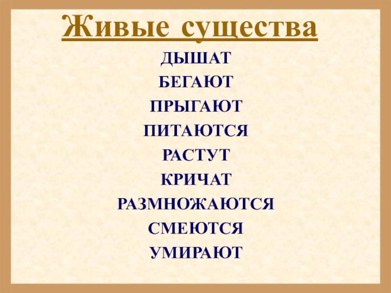Живые существа ДЫШАТ БЕГАЮТПРЫГАЮТ ПИТАЮТСЯРАСТУТКРИЧАТРАЗМНОЖАЮТСЯСМЕЮТСЯУМИРАЮТ