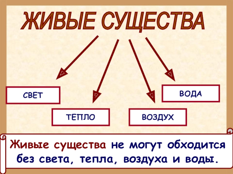 ЖИВЫЕ СУЩЕСТВА СВЕТТЕПЛОВОДАВОЗДУХЖивые существа не могут обходится без света, тепла, воздуха и воды.
