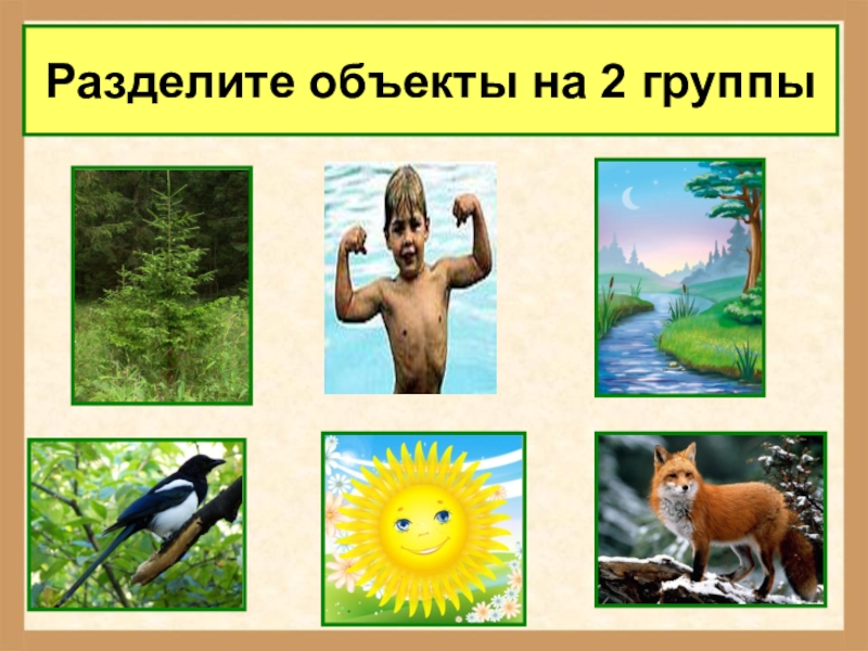 Слайд 7Разделите объекты на 2 группы