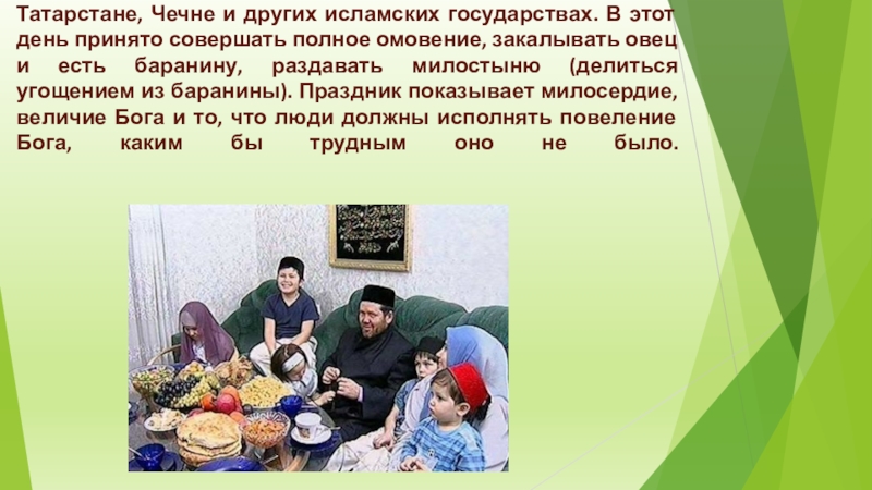 исламских государствах. В этот день принято совершать полное омовение, закалывать овец и есть баранину, раздавать милостыню (делиться угощением из баранины). Праздник показывает милосердие, величие Бога и то, что люди должны исполнять повеление Бога, каким бы трудным оно не было.