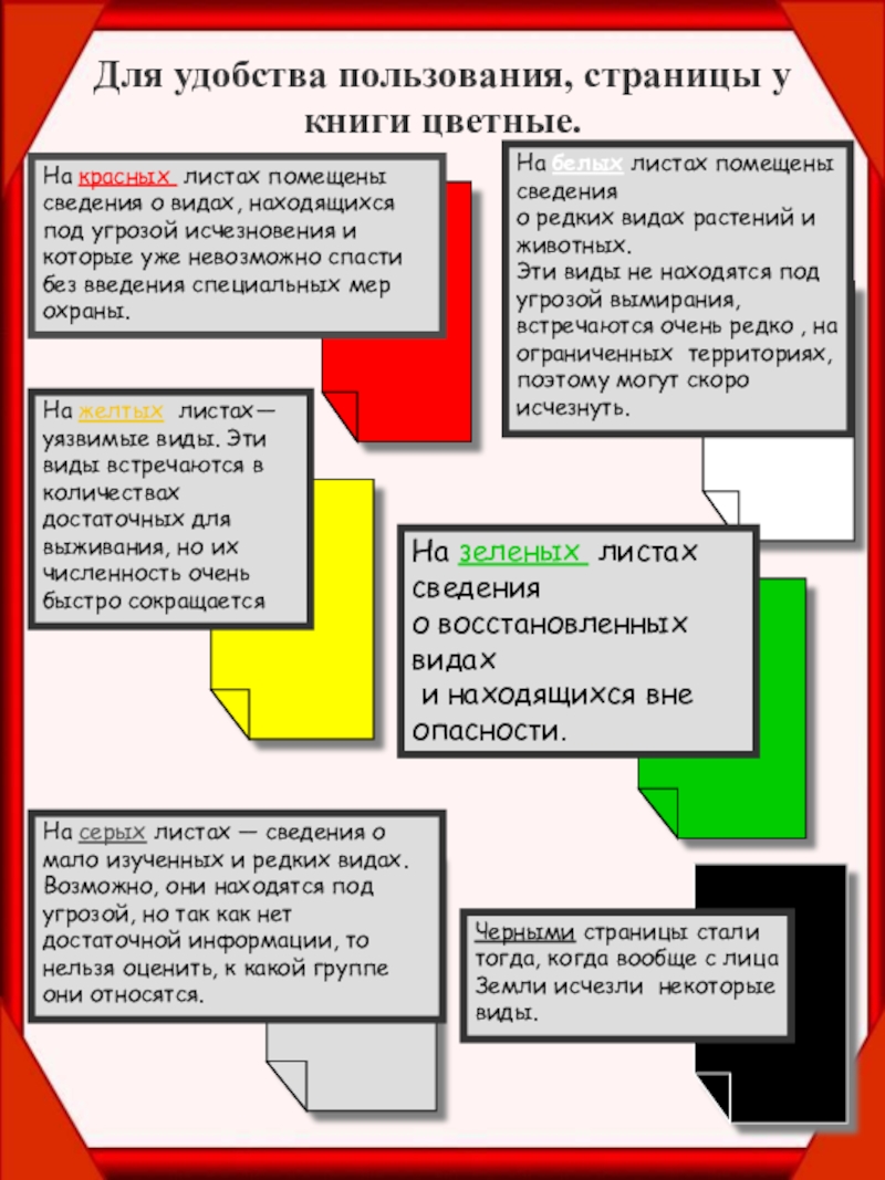 На серых листах — сведения о мало изученных и редких видах. Возможно, они находятся под угрозой, но так как нет достаточной информации, то нельзя оценить, к какой группе они относятся.