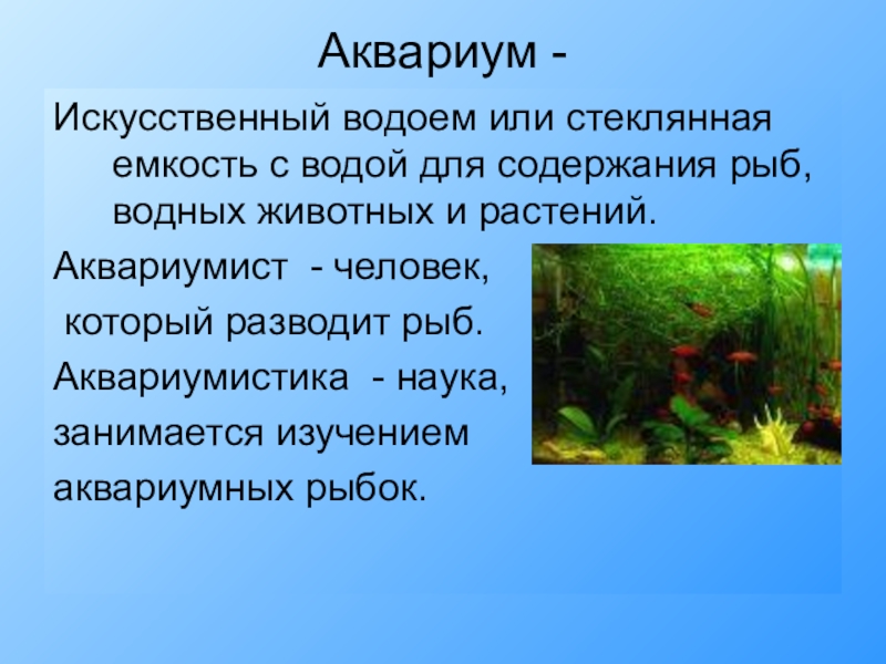 Аквариум - Искусственный водоем или стеклянная емкость с водой для содержания рыб, водных животных и растений.Аквариумист - человек, который разводит рыб.Аквариумистика - наука, занимается изучением аквариумных рыбок.
