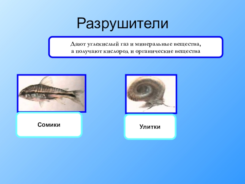 Разрушители Сомики Улитки Дают углекислый газ и минеральные вещества, а получают кислород и органические вещества