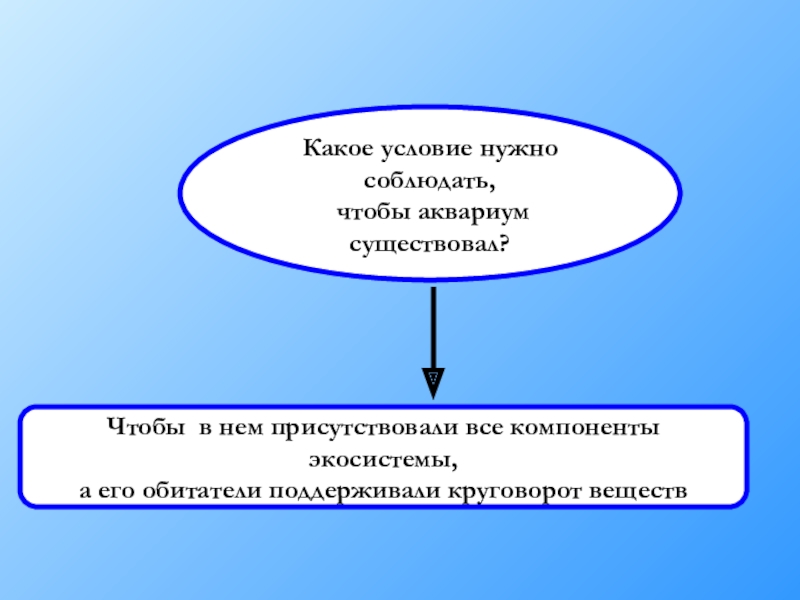 Какое условие нужно соблюдать, чтобы аквариум существовал?Чтобы в нем присутствовали все компоненты экосистемы, а его обитатели поддерживали