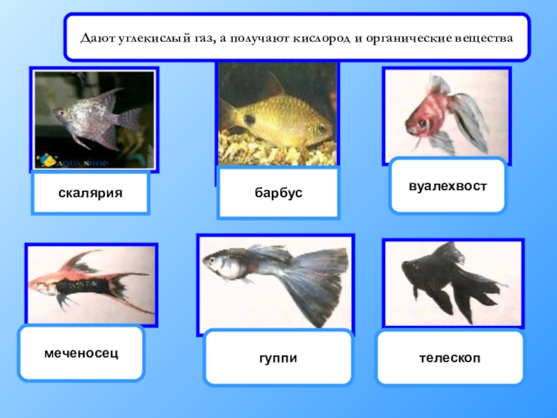 скаляриябарбусвуалехвостмеченосецгуппителескопДают углекислый газ, а получают кислород и органические вещества