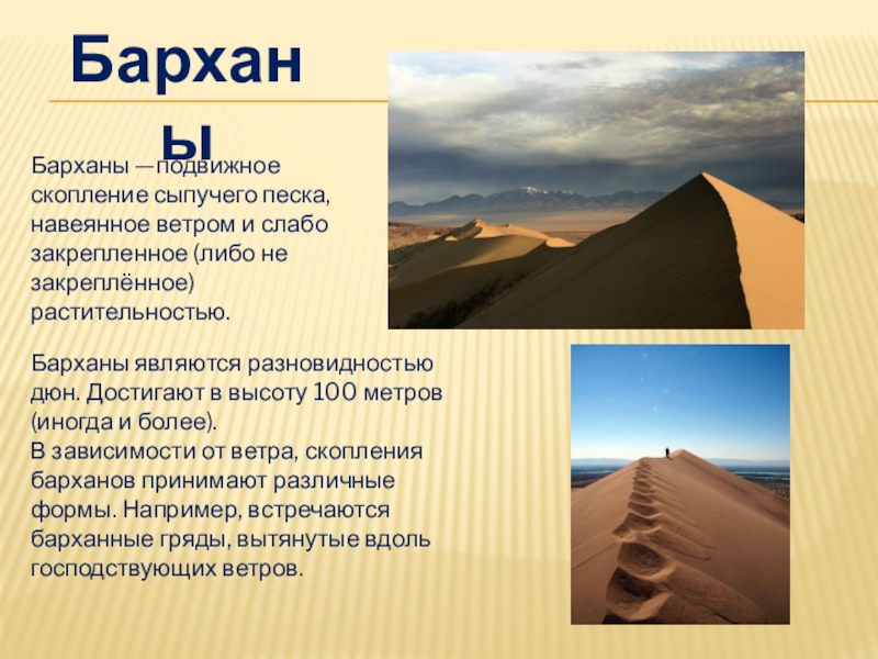 Барханы являются разновидностью дюн. Достигают в высоту 100 метров (иногда и более).