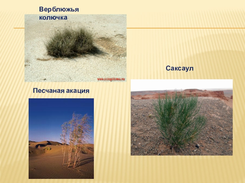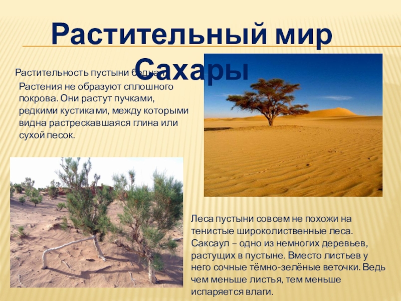 Леса пустыни совсем не похожи на тенистые широколиственные леса. Саксаул – одно из немногих деревьев, растущих в пустыне. Вместо листьев у него сочные тёмно-зелёные веточки. Ведь чем меньше листья, тем меньше испаряется влаги.