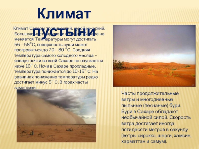 Часты продолжительные ветры и многодневные пыльные (песчаные) бури. Бури в Сахаре обладают необычайной силой. Скорость ветра достигает иногда пятидесяти метров в секунду (ветры сирокко, шерги, хамсин, харматтан и самум).