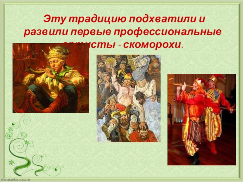 Слайд 4 Эту традицию подхватили и развили первые профессиональные артисты - скоморохи.