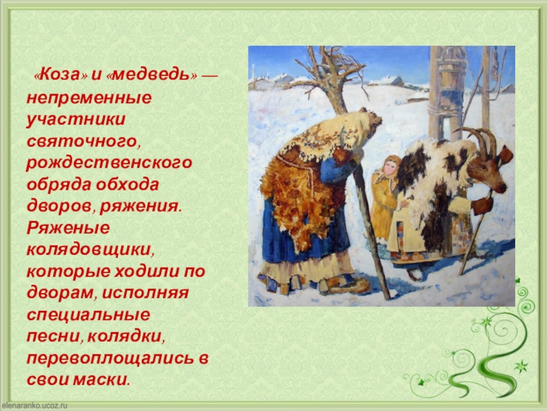 Слайд 3 «Коза» и «медведь» — непременные участники святочного, рождественского обряда обхода дворов,