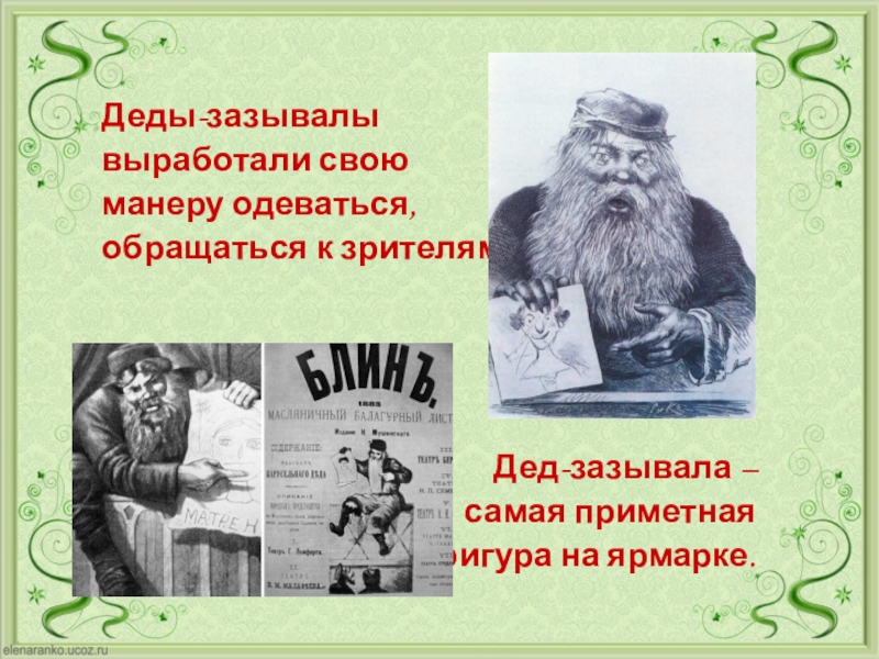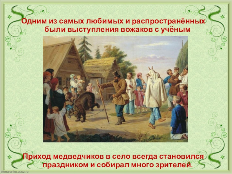 Слайд 6 Под игру скоморохов на дудах, бубнах медведи исполняли свои пляски и сценки. Поводыри