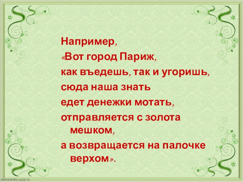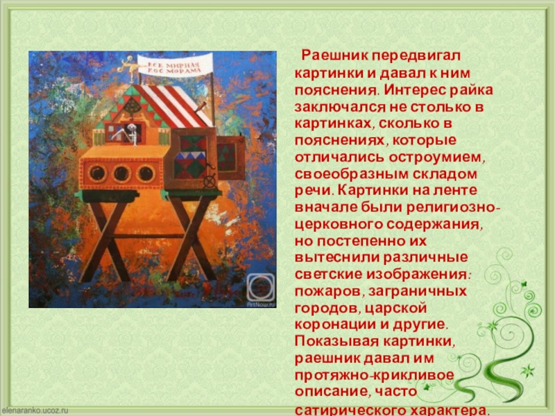 Слайд 14 Раешник передвигал картинки и давал к ним пояснения. Интерес райка заключался