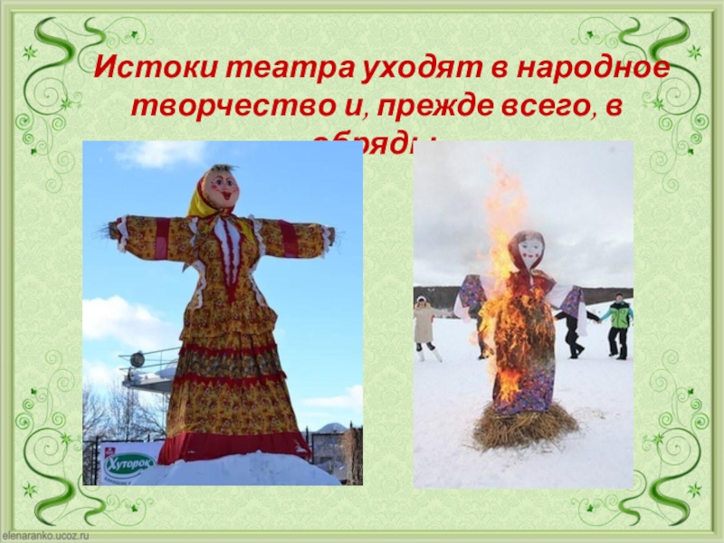 Слайд 2 Истоки театра уходят в народное творчество и, прежде всего, в обряды.
