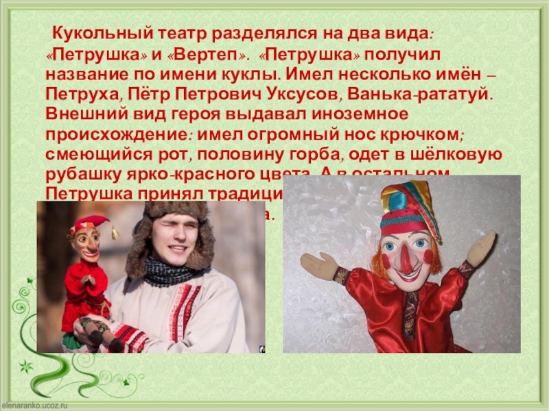 Слайд 9 Кукольный театр разделялся на два вида: «Петрушка» и «Вертеп». «Петрушка» получил название по