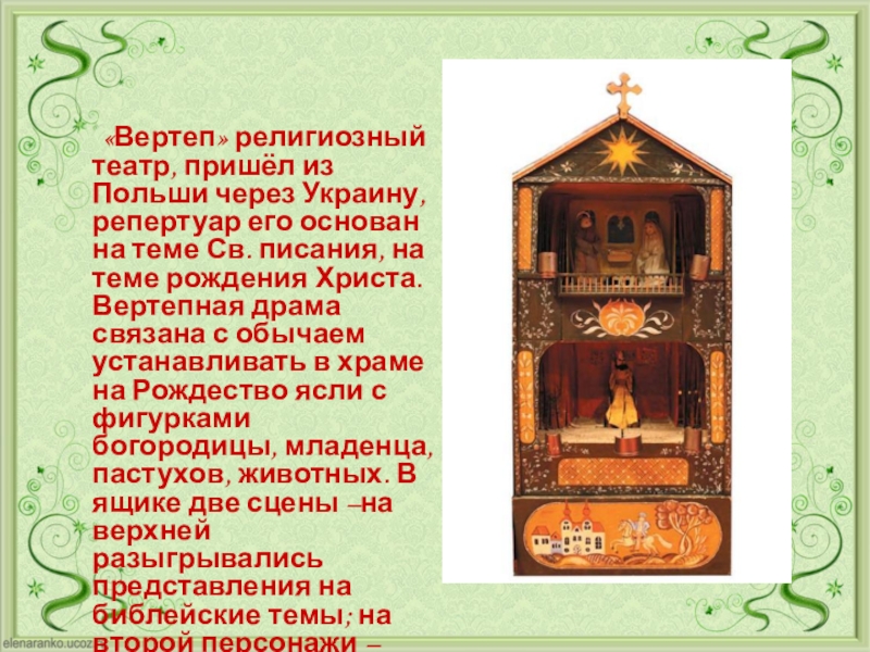 Слайд 11 «Вертеп» религиозный театр, пришёл из Польши через Украину, репертуар его основан на