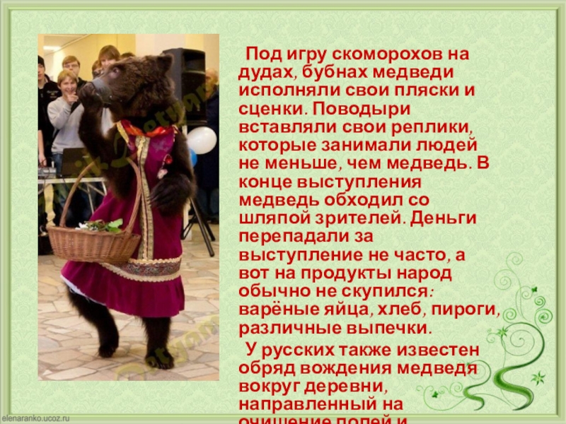 вставляли свои реплики, которые занимали людей не меньше, чем медведь. В конце выступления медведь обходил со шляпой зрителей. Деньги перепадали за выступление не часто, а вот на продукты народ обычно не скупился: варёные яйца, хлеб, пироги, различные выпечки.