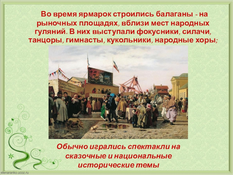 Слайд 7 Во время ярмарок строились балаганы - на рыночных площадях, вблизи мест народных гуляний.