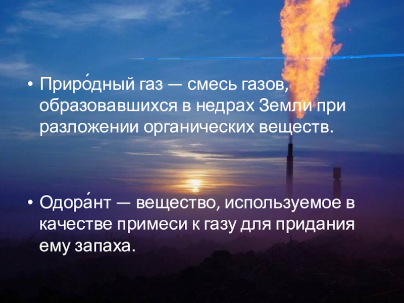 Приро́дный газ — смесь газов, образовавшихся в недрах Земли при разложении органических веществ.Одора́нт — вещество, используемое в