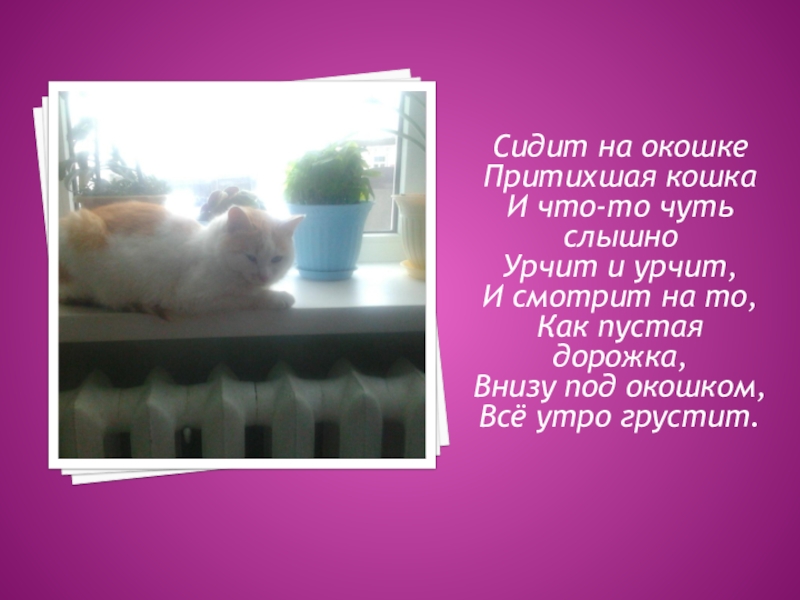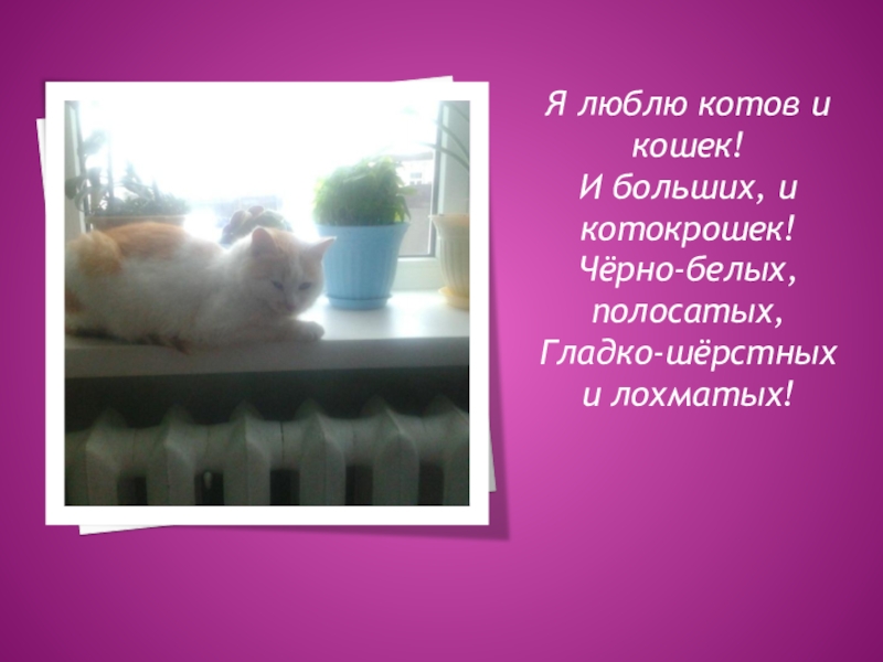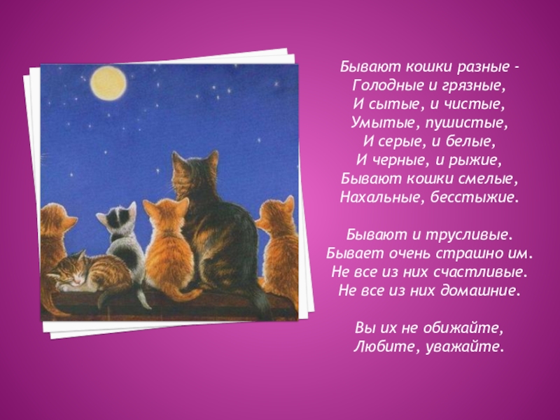 уме и независимости. Мы восхищаемся их красотой и грацией, любуемся ими, когда они спят или позволяют себя гладить. Практически все мы уверены, что кошки очень многое знают о нас. Мы так любим кошек, что нам хочется писать о них стихи, или читать, если писать не получается...