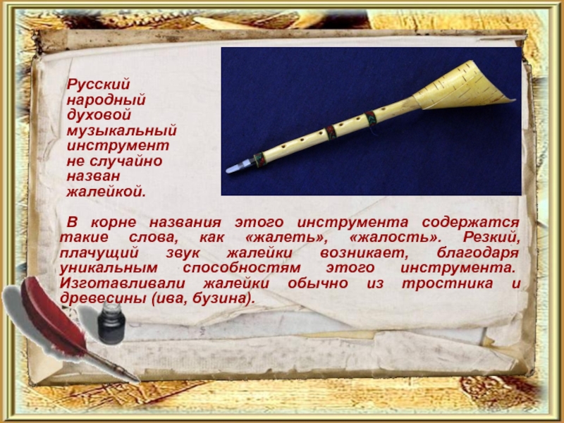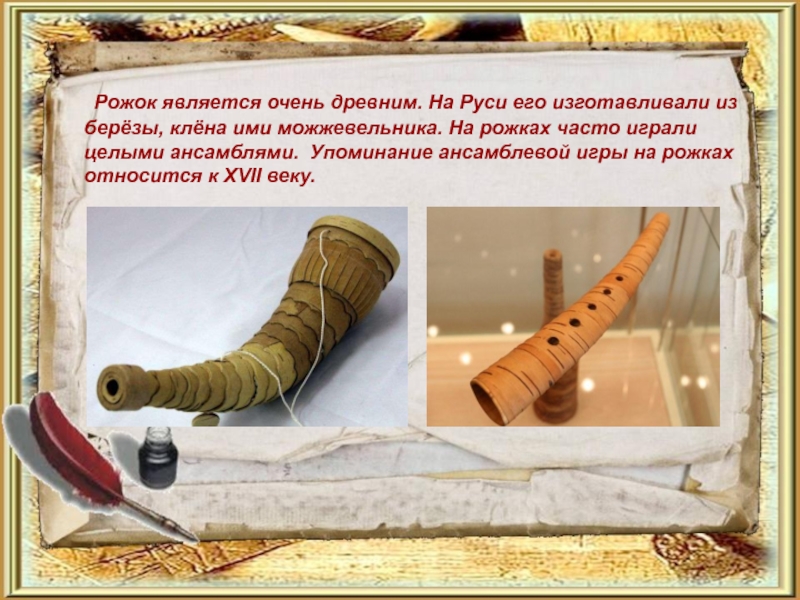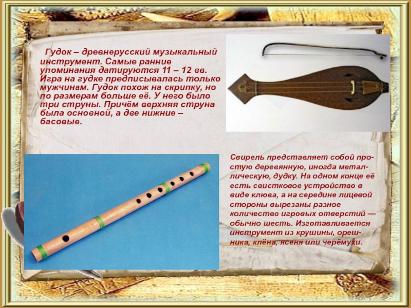 Свирель представляет собой про-стую деревянную, иногда метал-лическую, дудку. На одном конце её есть свистковое устройство в виде клюва, а на середине лицевой стороны вырезаны разное количество игровых отверстий — обычно шесть. Изготавливается инструмент из крушины, ореш-ника, клёна, ясеня или черёмухи.
