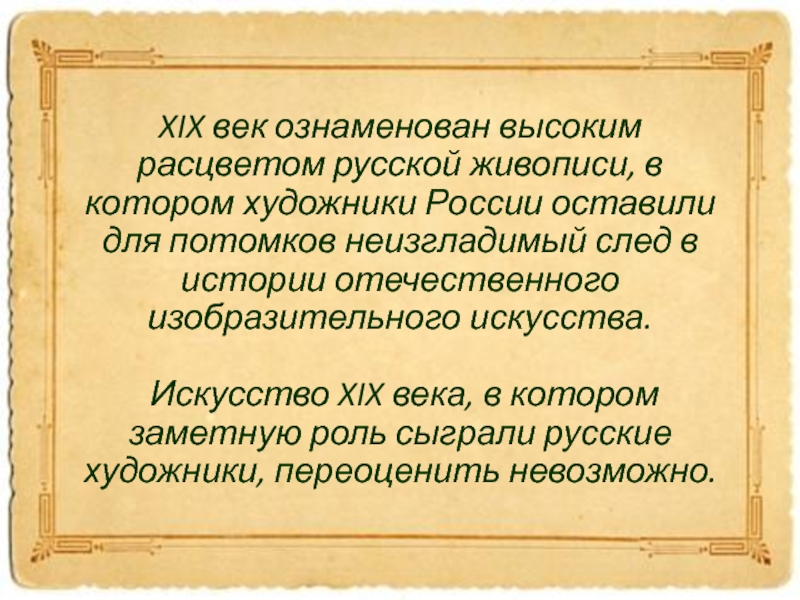 XIX век ознаменован высоким расцветом русской живописи, в котором художники России оставили для потомков неизгладимый след в истории отечественного изобразительного искусства. Искусство XIX века, в котором заметную роль сыграли русские художники, переоценить невозможно.
