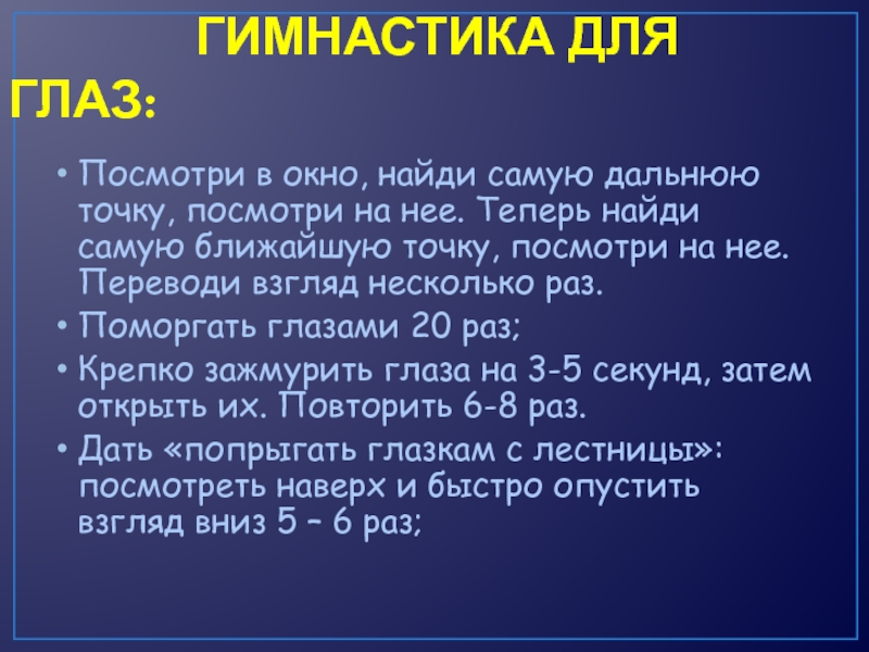 Крепко зажмурить глаза на 3-5 секунд, затем открыть их. Повторить 6-8 раз.