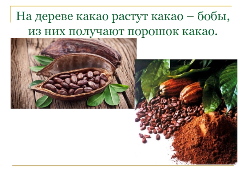 Слайд 4На дереве какао растут какао – бобы, из них получают порошок